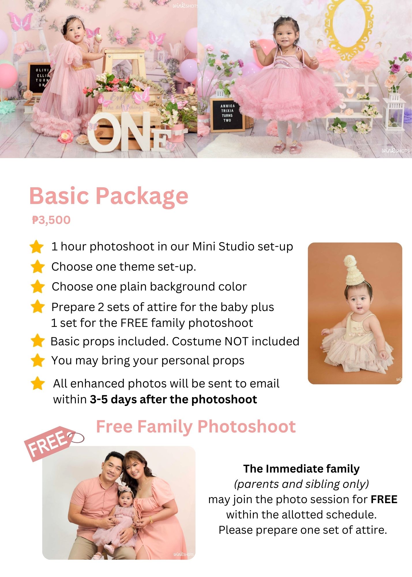 Since our studio is a mini studio, we kindly ask that only a few may join / go inside the studio during the photoshoot (3-4 people only – the parents, siblings of the celebrant / one companion). This is to avoid overcrowding and ensure a smooth and comfortable session. Maraming Salamat po.